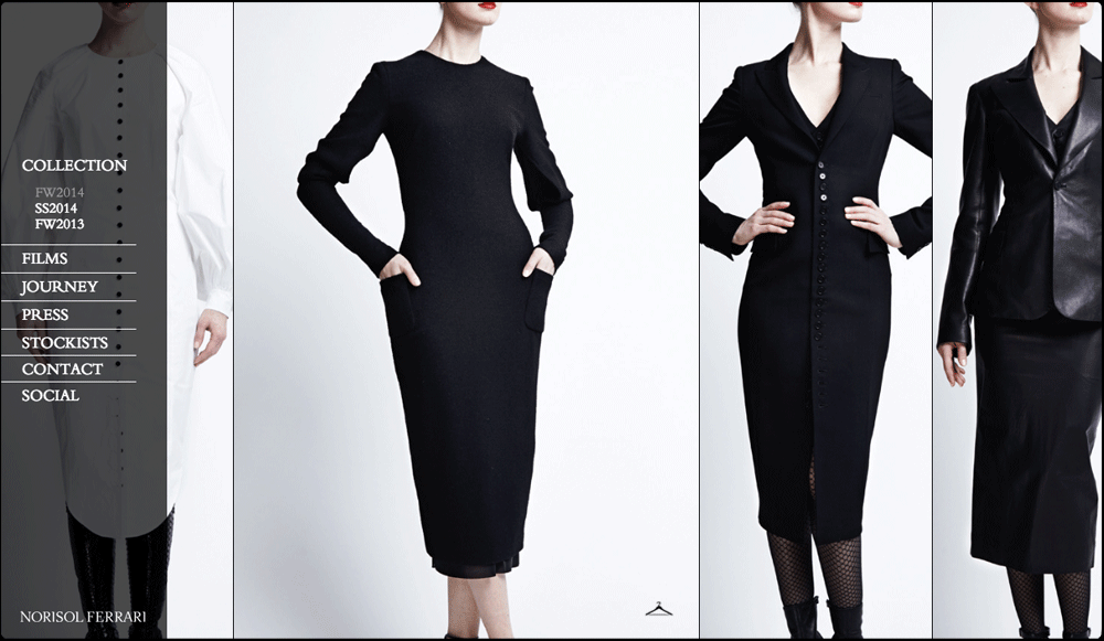 Approach & Results The website exhibits this retro-abstract chic style by maximizing high contrast black and white imagery in a minimalist layout. This visual design bestows a jarring but alluring aesthetic of Ferrari’s fashions. Ferrari’s designs are a beautiful clash of daring fashion styles, so I wanted the website to let the clothes speak for themselves. I went for a monochrome color scheme because I didn’t want other colors to detract from the designs and that also complemented display of bold imagery.