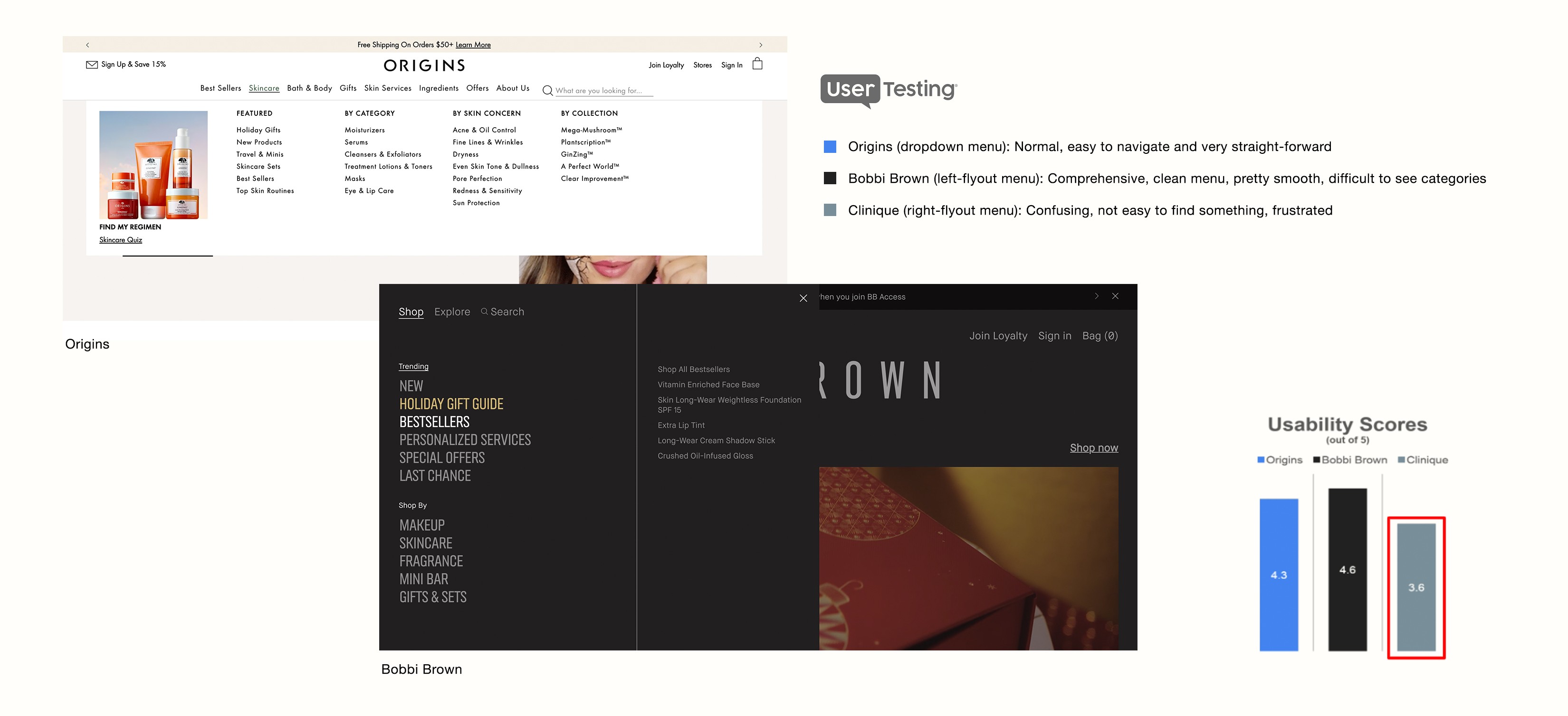 Our UX research team tested top-level navigation designs with five participants, comparing Origins' dropdown menu, Bobbi Brown's left-side fly-out menu, and Clinique's navigation. Four participants found Origins' navigation "very easy" to use, while Clinique's right-pane fly-out menu was criticized for limited visibility and disorienting interactions.