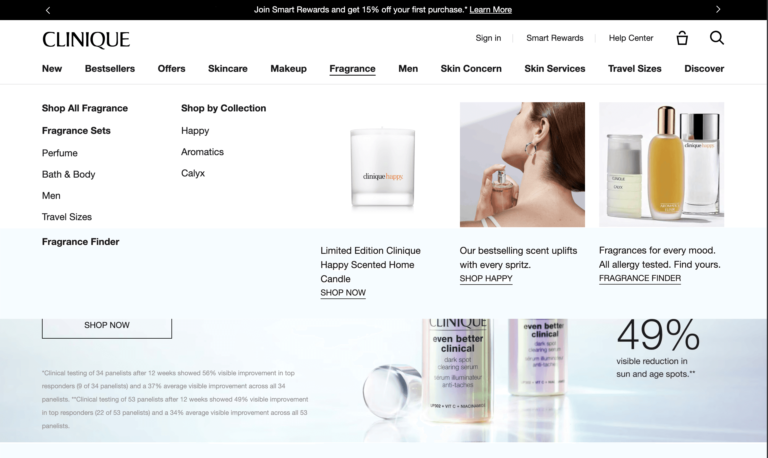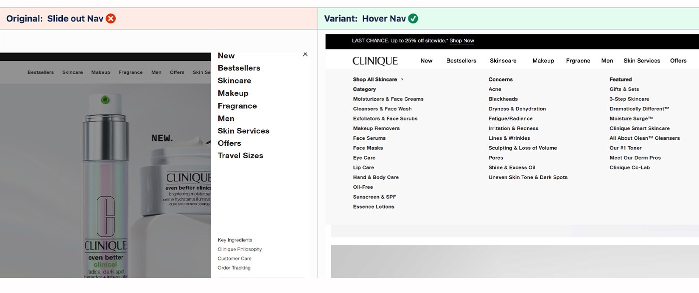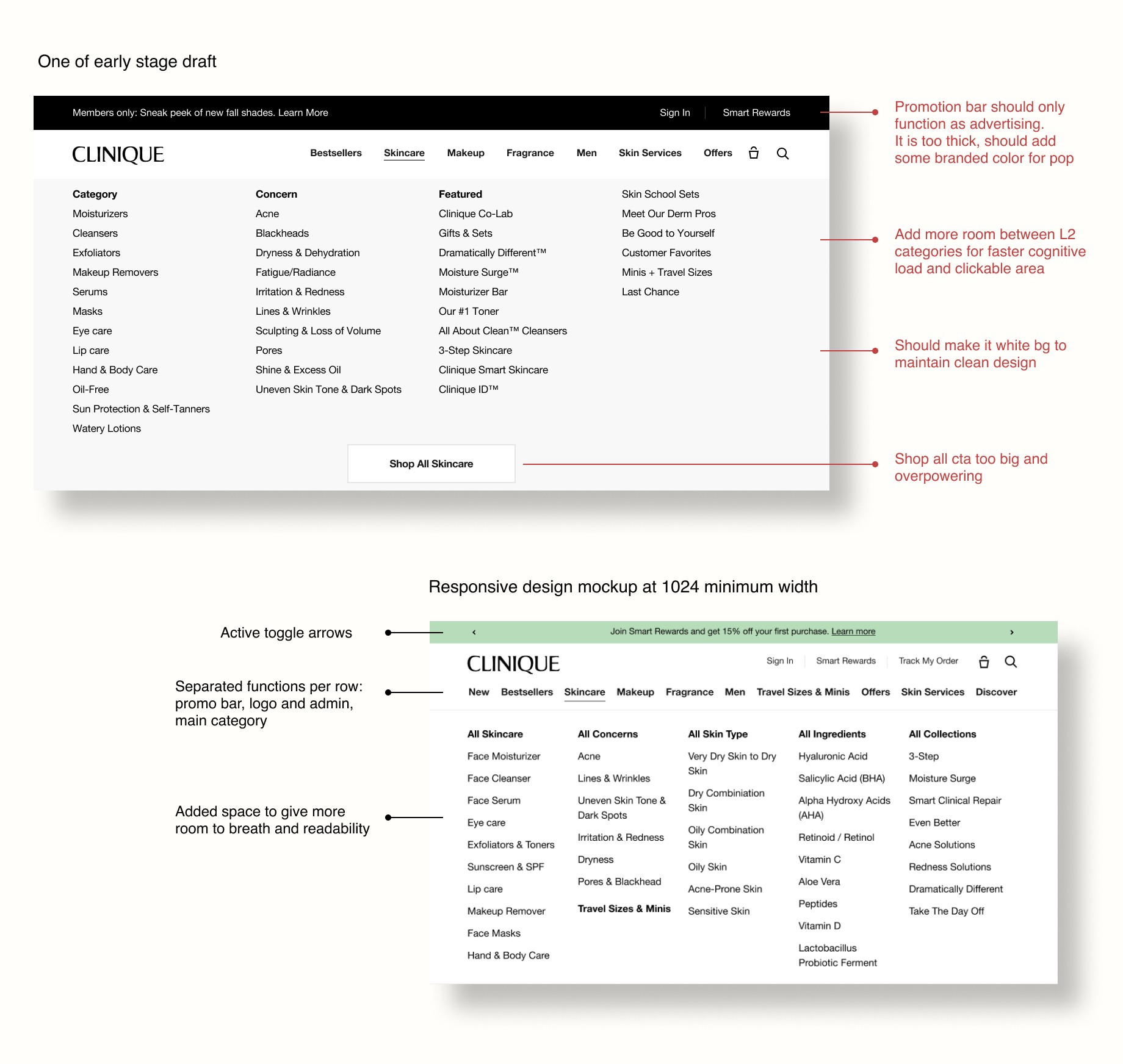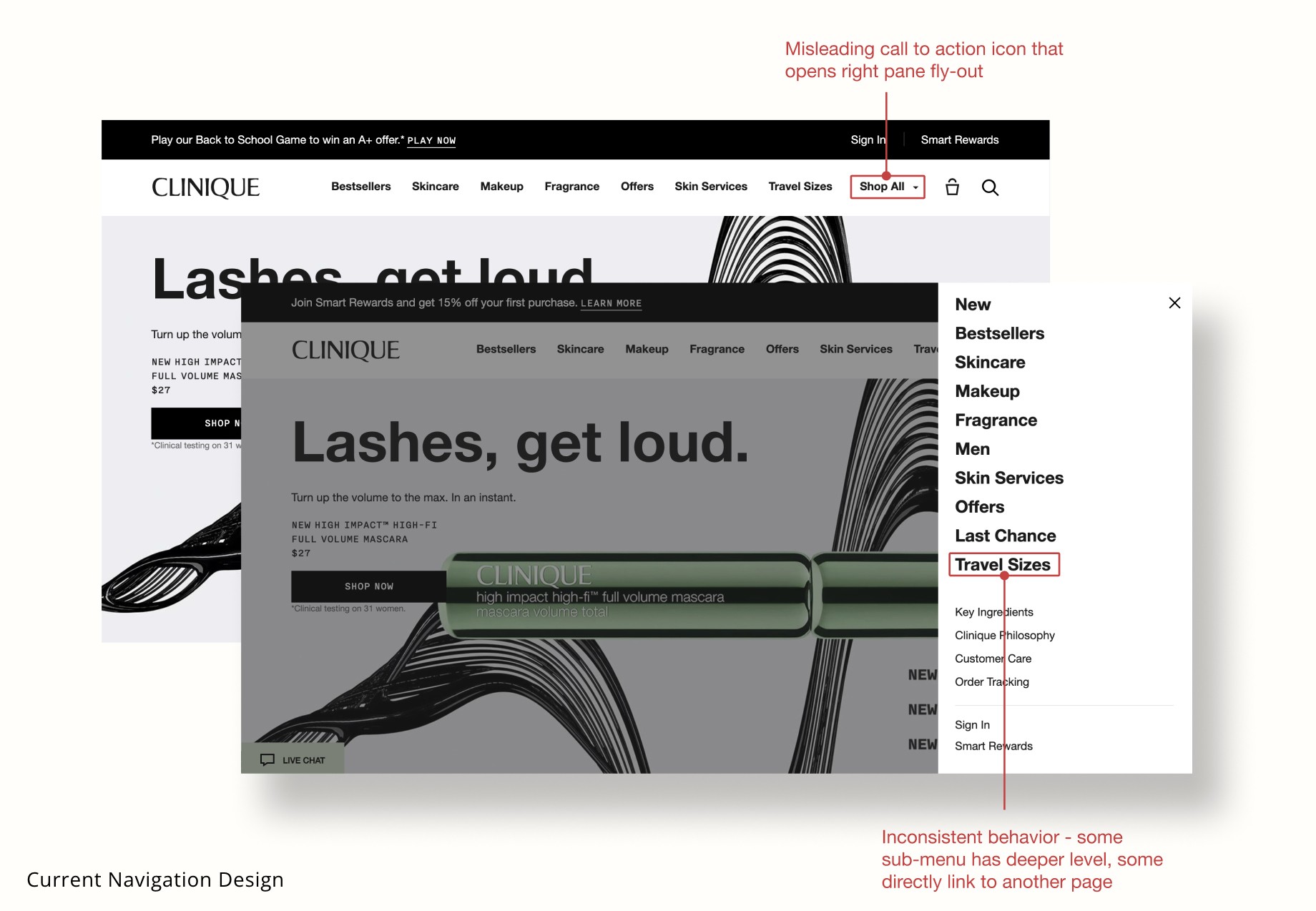 The right hand fly-out function of the Shop All feature within Clinique’s navigation system is the most underutilized button and causes the customer friction when attempting to navigate Clinique’s website. It also needed updates on taxonomy, reorganization of popular menu to better serve customers needs.